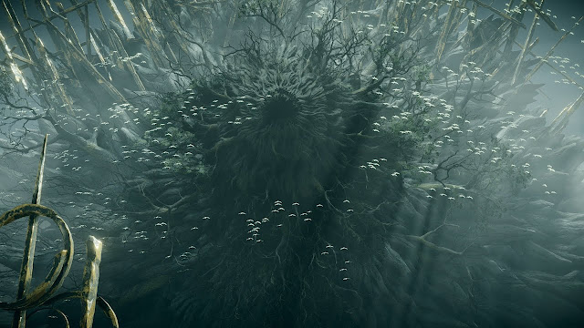 The Capital Tree is monstrously overgrown. You will see its roots long before you see the city walls. Its sap runs thickly in the streets; its fallen leaves blanket the Eternal Sea. Its twin trunks clamber over one another thousands of feet into the air.